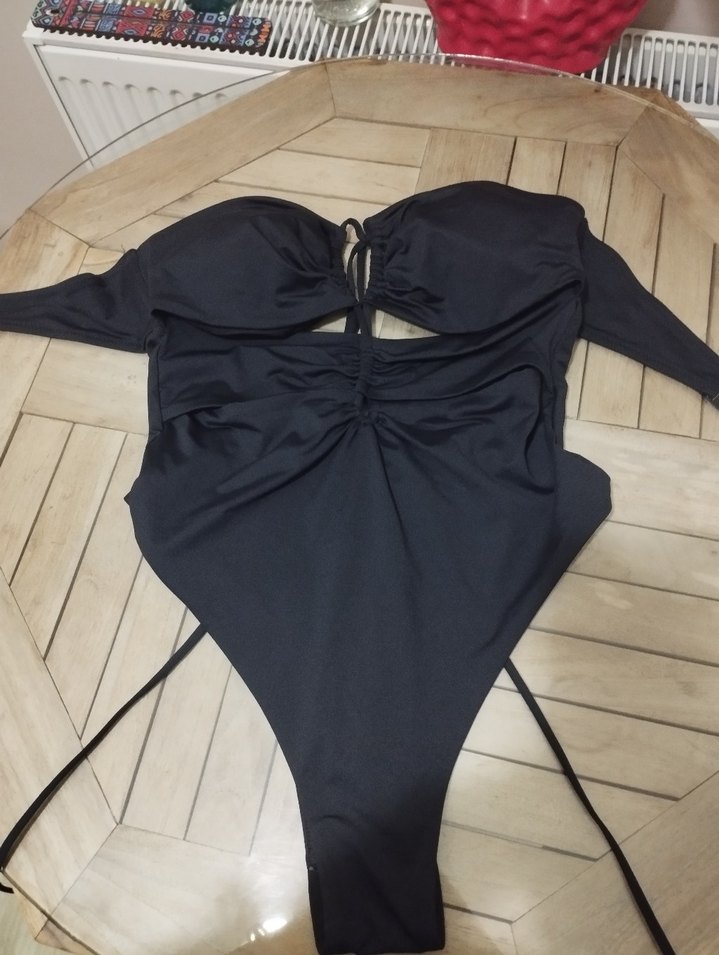 Siyah, uzun kollu ve drapeli tasarıma sahip, vücuda oturan kadın mayosu. Cesur ve minimal goth tarzına uygundur.