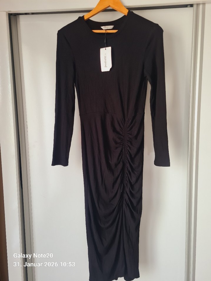 Siyah uzun kollu, keten kumaştan yapılmış, drapeli ve dar kesimli elbise. Minimalist gotik stil için uygundur, romantik akşamlar için ideal.