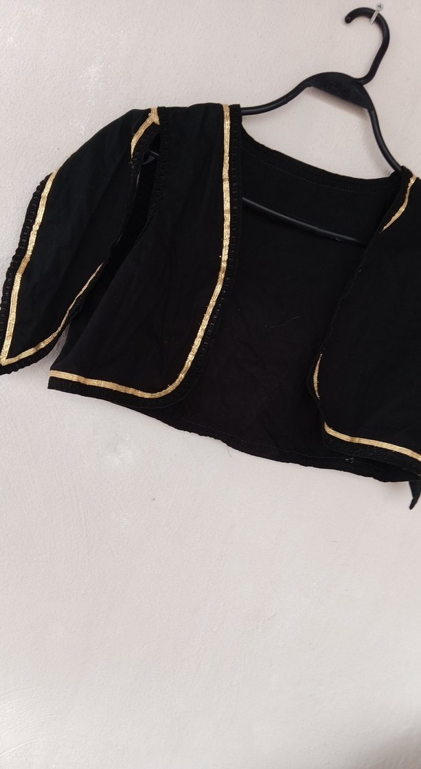 Uzun kollu, kayık yaka, drapeli ve altın şerit detaylı siyah fitted kız bolero, sentetik kumaştan yapılmıştır. Goth tarzını yansıtır. ölçüsü var yaşı bilmiyorum ölçüye bakın alın