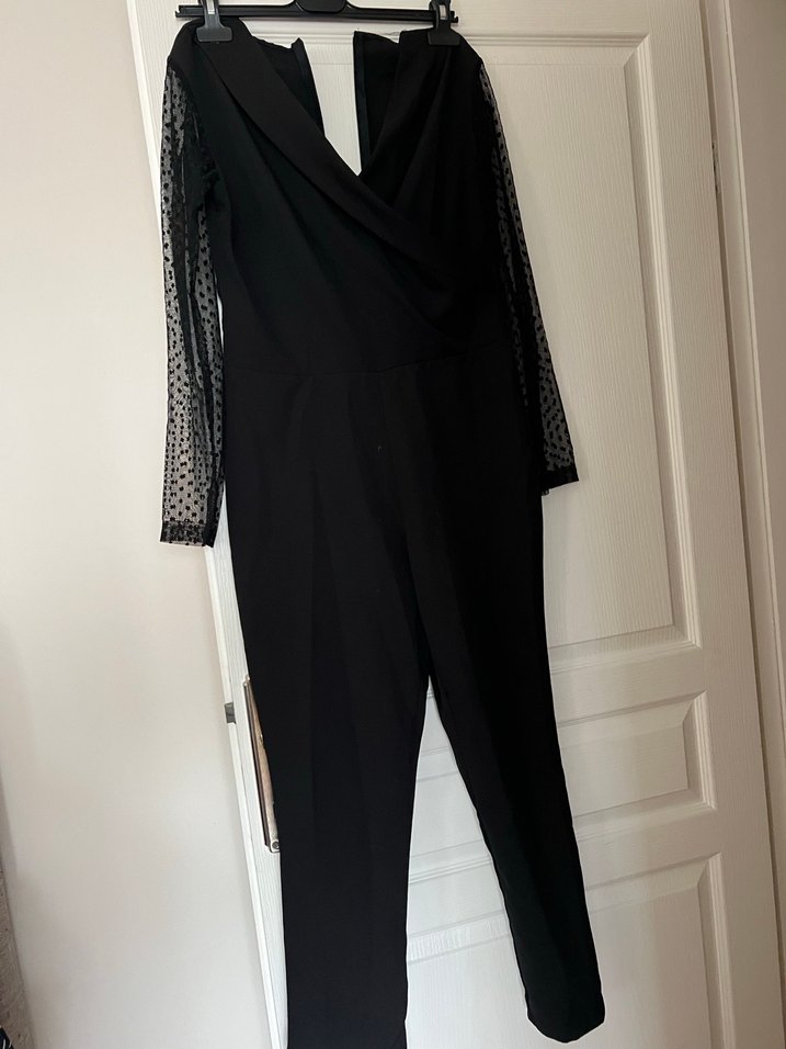 Siyah tulum, yakası kesik ve uzun, puantiyeli tüllü kolları vardır. Drapeli tasarımı ve klasik kesimiyle ofis için uygundur.