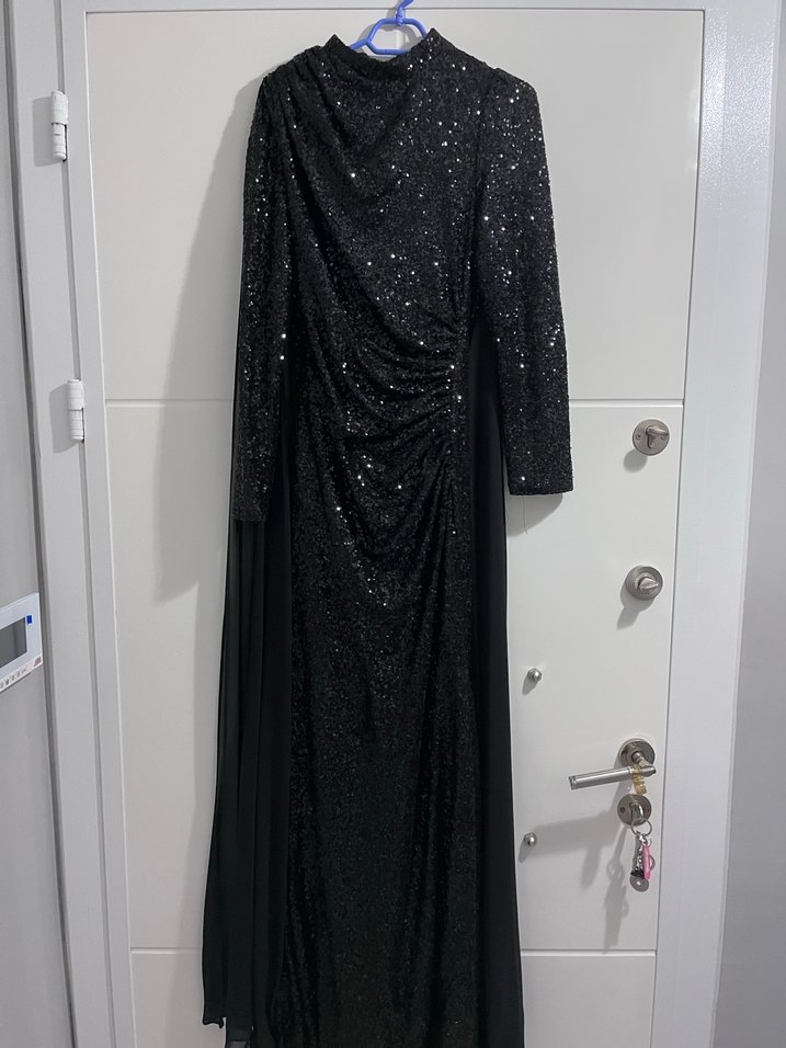 Yüksek yakalı, uzun kollu, drapeli ve desenli ışıltılı siyah uzun abiye elbisedir. Parlak detaylarla gösterişli bir görünüm sunar. ✨