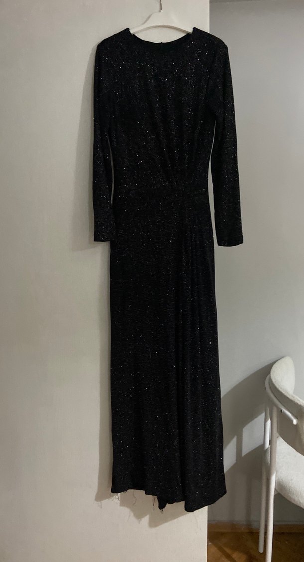 Bu siyah uzun elbise, uzun kollu ve V yakalı olup, şık drapeli detaylara sahiptir. Romantik akşamlar için uygundur. ✨