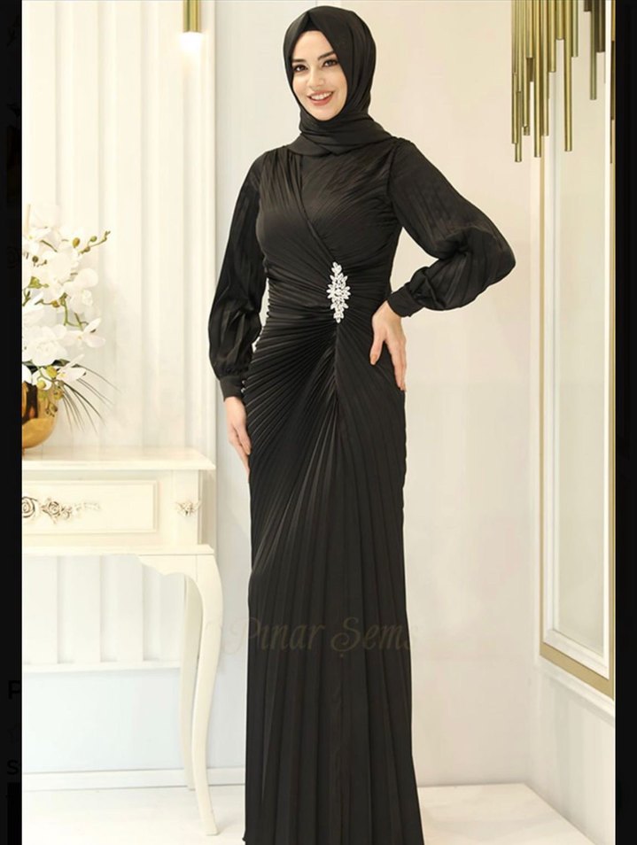 Yüksek yakalı, uzun kollu ve şık drapeli detaylara sahip, broş süslemeli siyah uzun elbise, ofis ortamları için uygundur. Sayfamdaki bütün abiyeler bir kere giyilmiştir