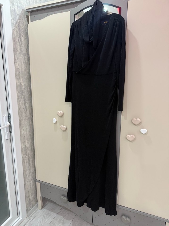 Uzun kollu, yüksek yakalı ve drapeli tasarıma sahip, vücuda oturan uzun elbise. İpeksi kumaştan yapılmış, koyu renkli ve desensiz gotik stil, ofis için uygun.