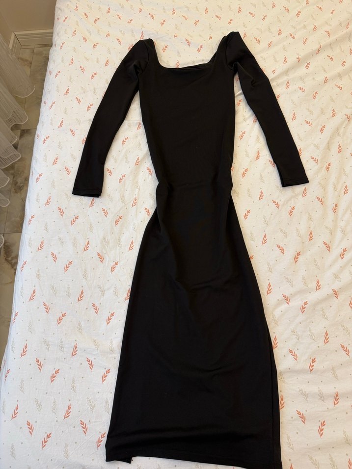 Uzun kollu ve kayık yaka detaylı, drapeli siyah uzun elbise, romantik akşamlar için uygundur. Bedeni s.