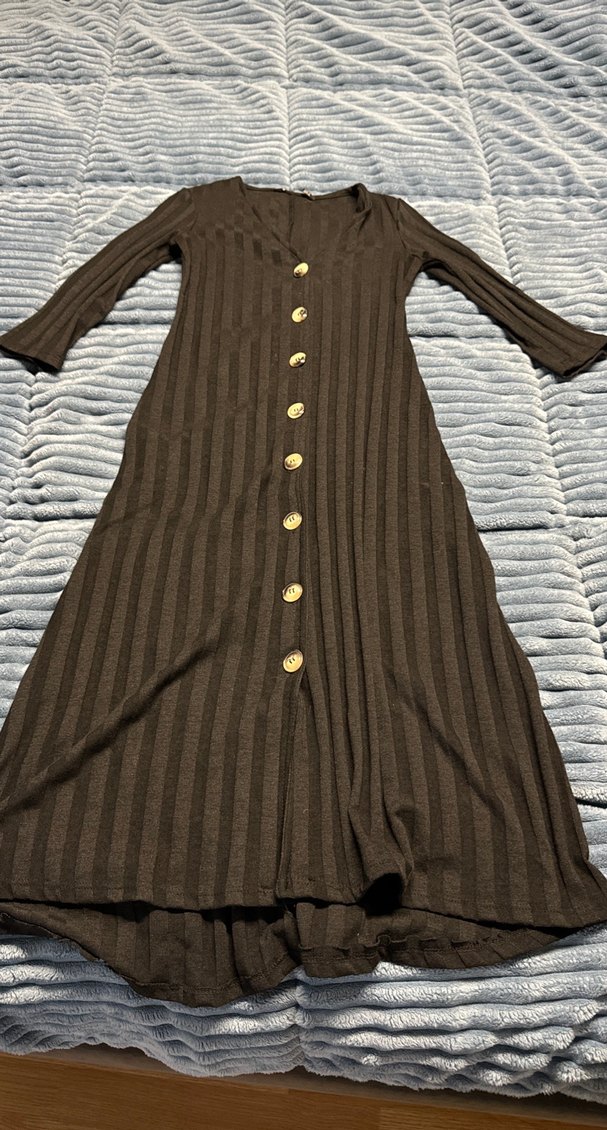 Kahverengi, uzun kollu, düğmeli ve V yakalı bu uzun elbise, yumuşak sentetik kumaştan olup rahat ve gündelik bir tarza sahiptir.