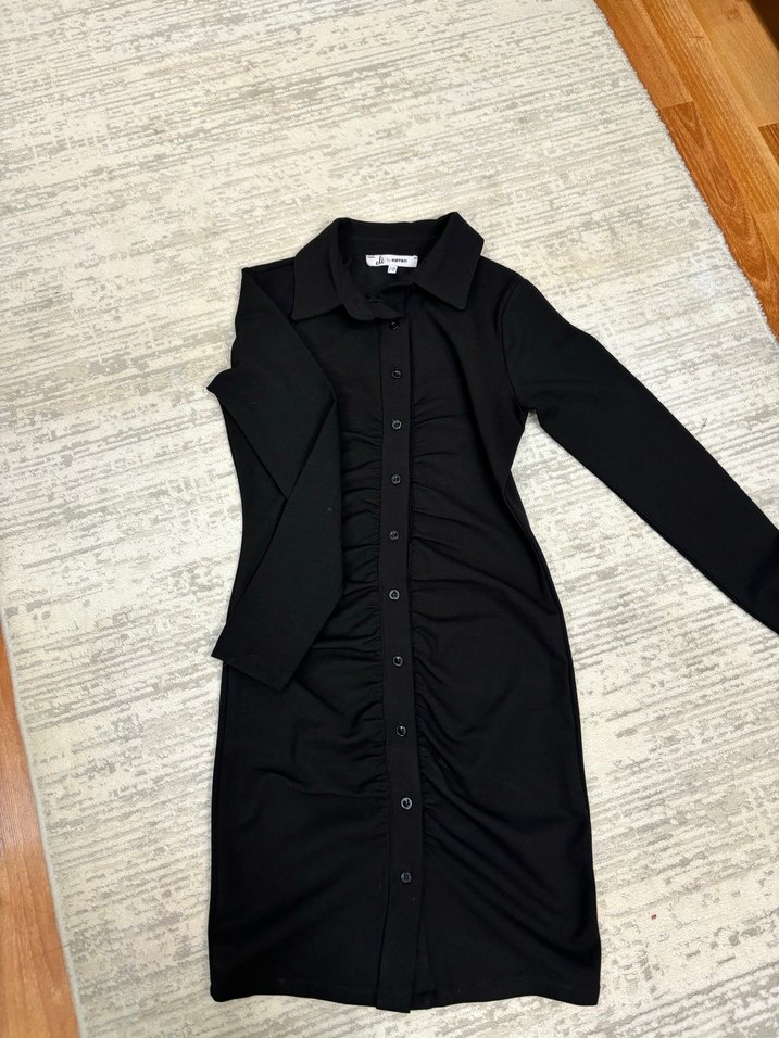 Düğmeli, yakalı ve uzun kollu bu siyah elbise, vücuda oturan kesimiyle ofis ve gündelik gotik tarzına uygundur.