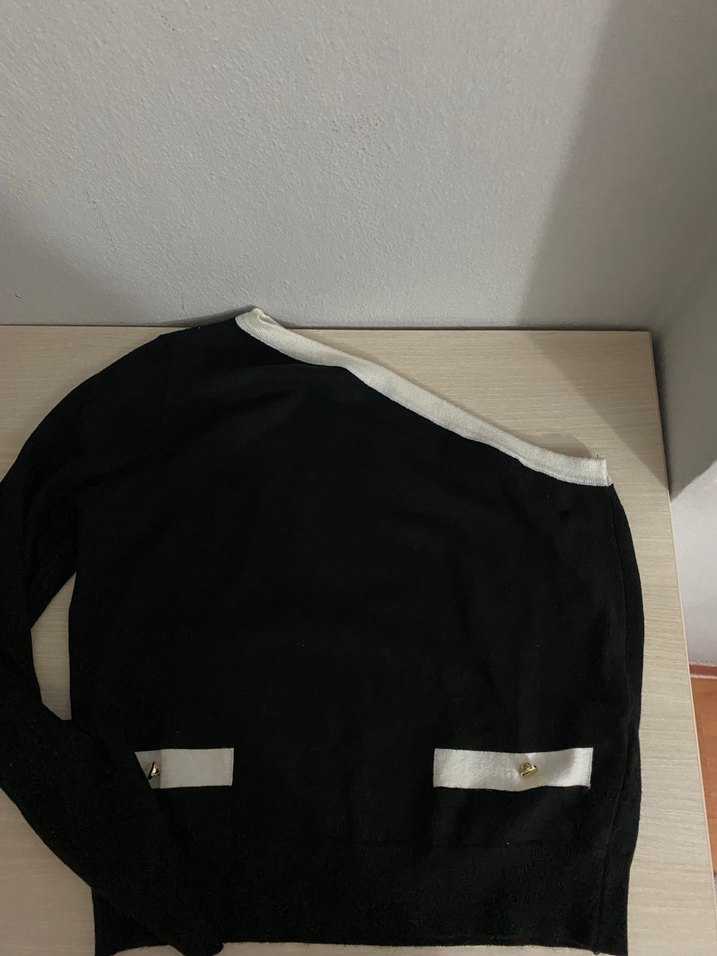 Bu siyah, uzun kollu kadın kazağı, tekne yaka ve düğme detaylarına sahiptir. Yumuşak ve sıcak kumaştan üretilmiştir, günlük kullanıma uygundur.