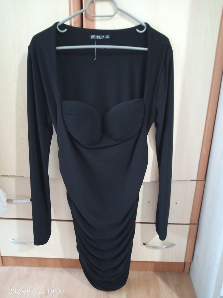 Uzun kollu, siyah, vücuda oturan gece elbisesi. Cesur, minimalist goth tarzında, romantik akşamlar için uygun. L beden yaziyo ama M için uygun dar kalıp hiç kullanilmadi