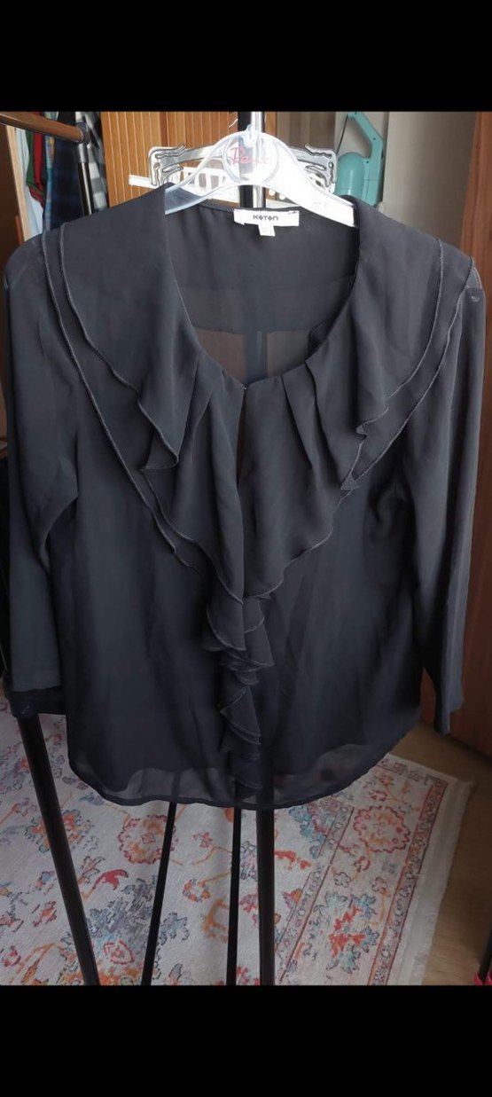 Yumuşak sentetik kumaştan yapılan, uzun kollu, yakalı ve fırfır detaylı siyah bol kesim bluz.