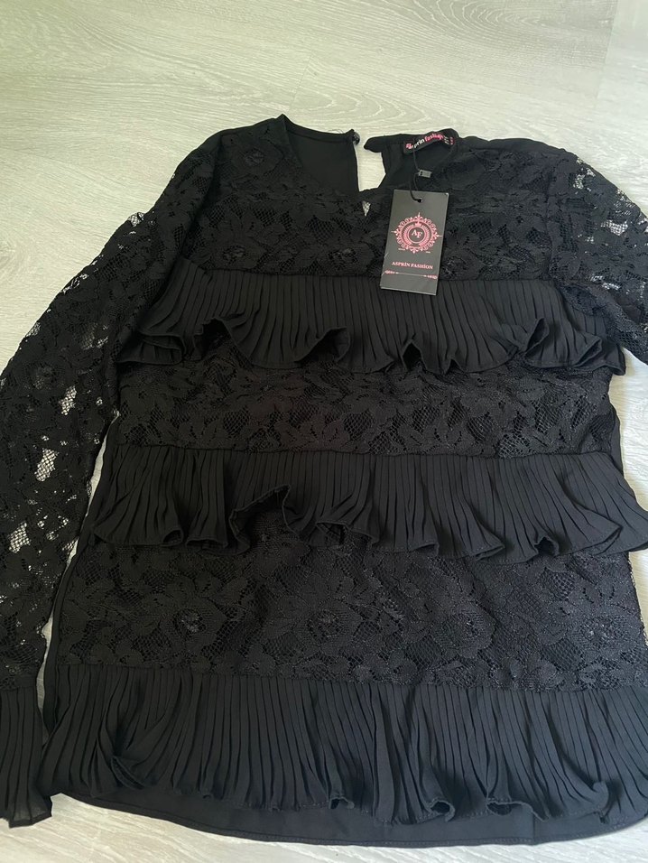 Uzun kollu, kolları dantel detaylı , desenli sentetik kumaştan yapılmış siyah, vücuda oturan ve fırfır detaylı bluz. Romantik akşamlar için uygun.