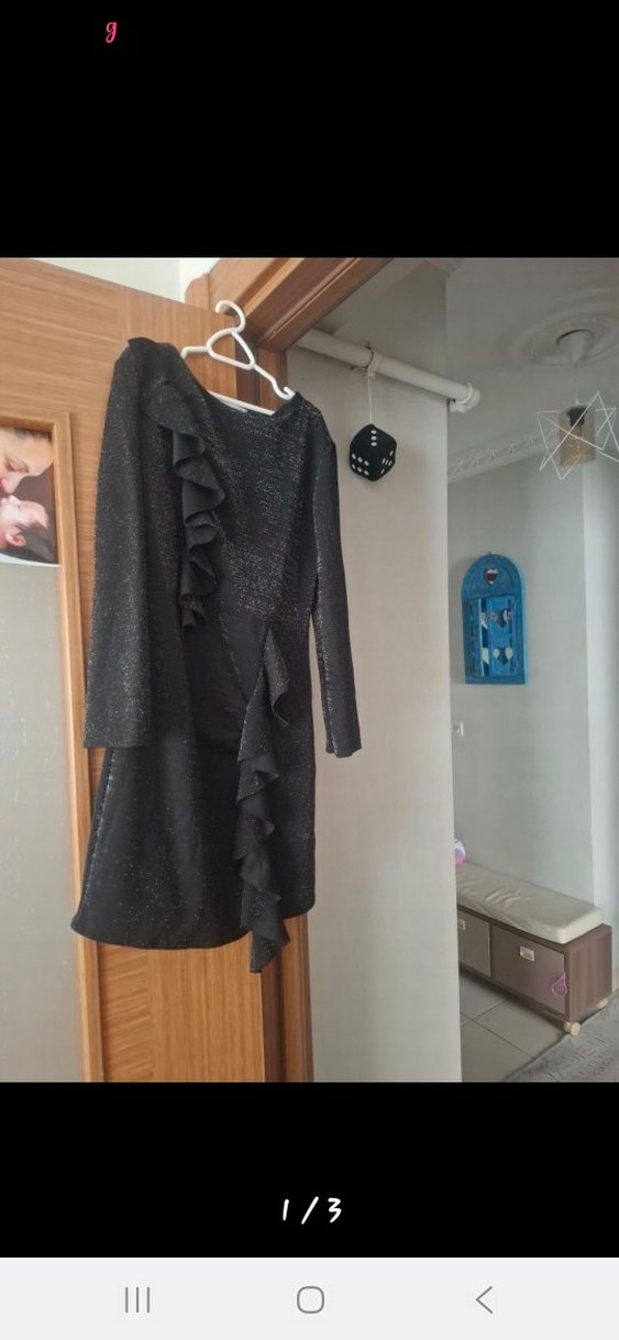 Uzun kollu, siyah, vücuda oturan gotik elbise, fırfır detayları ve kesik yaka ile ofis için uygun rahat bir tarz sunar.