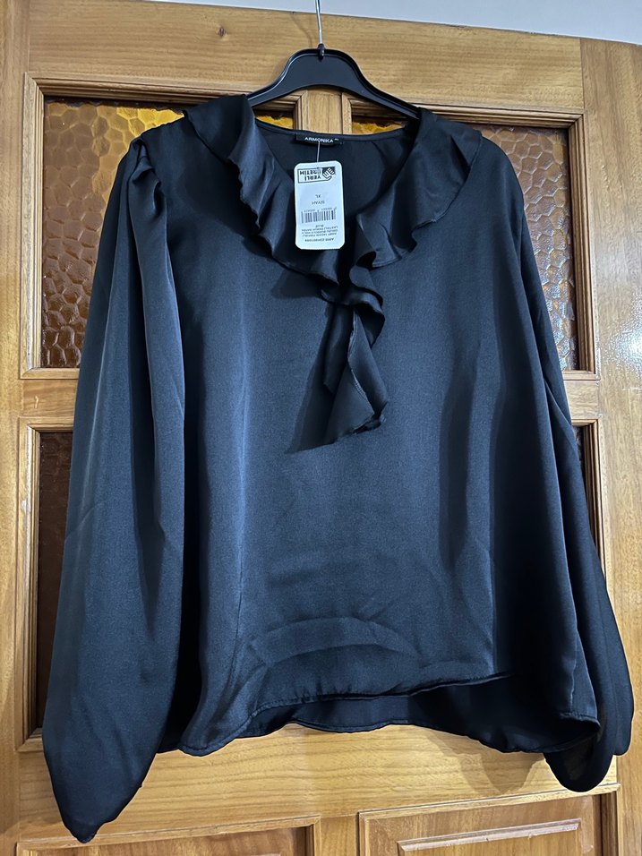 Uzun kollu, yakalı ve fırfırlı detaylara sahip siyah bluz. İpek gibi dokusuyla rahat ve salaş kesim, hem günlük hem ofis kullanımı için uygundur.