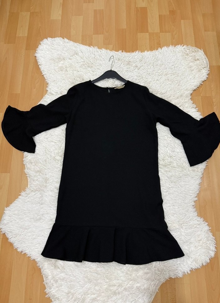 Siyah uzun kollu, bol kesim elbise. Kollar ve etek ucu fırfırlı, yumuşak ve sıcak kumaştan üretilmiştir. Yuvarlak yaka ile rahat ve şık bir görünüm sunar.