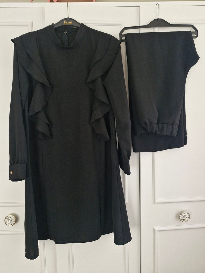 Uzun Kollu Siyah Fırfırlı Kadın Takım