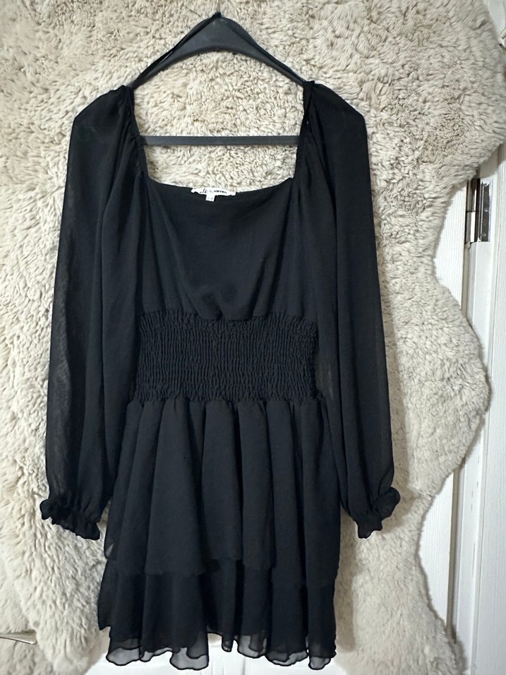 Uzun kollu, tek renk siyah mini elbise. Kayık yaka ve fırfır detaylarıyla, bol kesim ve büzgülü bel kısmına sahiptir. Sentetik kumaştan yapılmıştır, romantik akşamlar için uygundur.