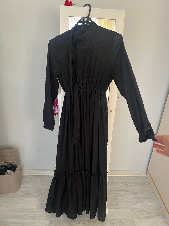 Siyah uzun elbise, uzun kollu, yüksek yakalı ve fırfırlı detaylara sahiptir. Gevşek kesim, yumuşak sentetik kumaştan, mütevazı ofis kullanımı için uygun, gotik Paris tarzında.