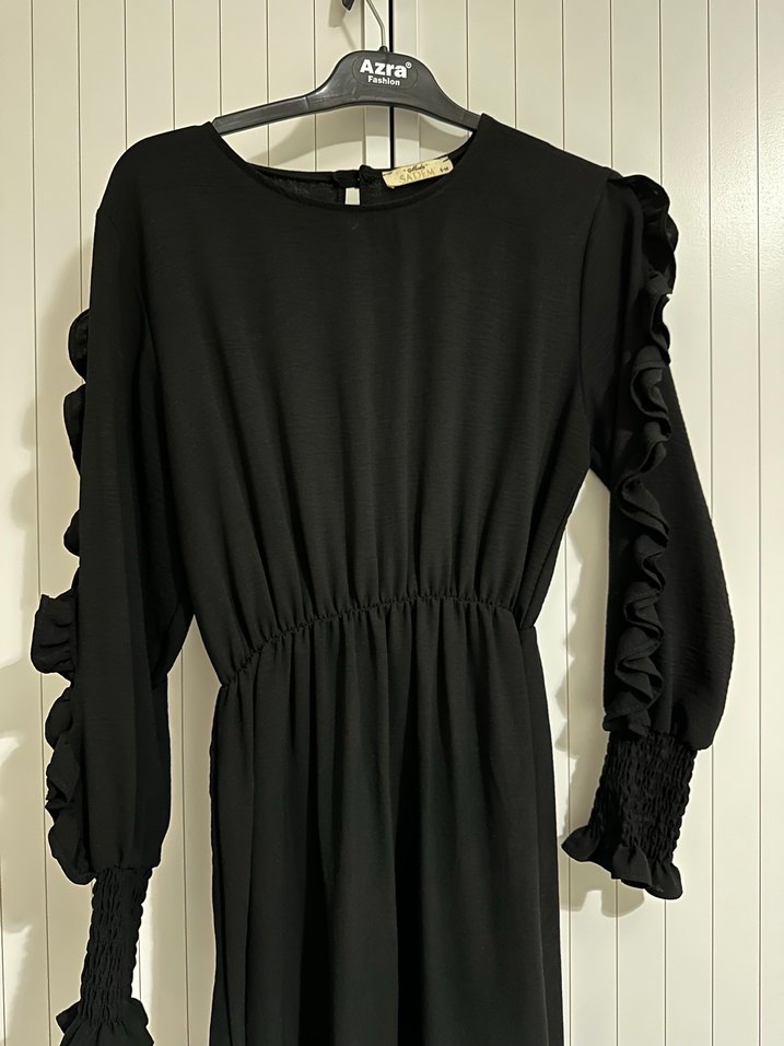 Siyah uzun elbise, uzun kollarda fırfır detayları ve bol kesimiyle dikkat çeker. Yuvarlak yakalı ve yumuşak sentetik kumaştan üretilmiştir.