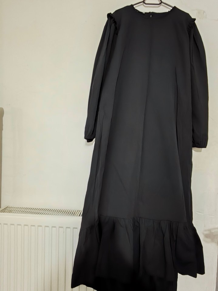 Siyah uzun elbise, yüksek yakalı ve uzun kolludur. Omuz ve etek kısmında fırfır detayları bulunur. Gevşek kesim, minimalist gotik tarzda, sentetik kumaştan üretilmiştir. Günlük ve mütevazı kullanıma uygundur.