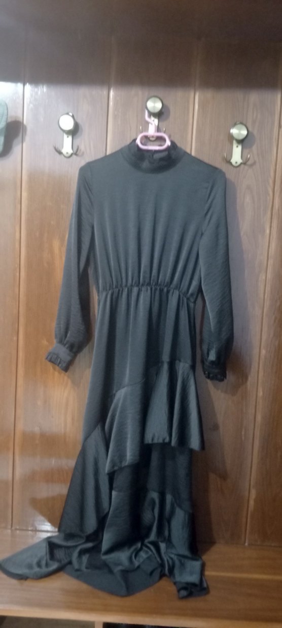 Uzun kollu, yüksek yakalı siyah elbise, yumuşak sentetik kumaştan, bol kesim ve fırfır detaylıdır. Günlük rahat kullanıma uygundur.