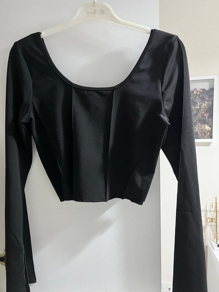 Tek renk siyah, uzun kollu ve tekne yaka olan bu fitted bluz, sentetik kumaştan yapılmıştır ve hafif pile detaylara sahiptir. Ofis için uygun şık gotik tarz.