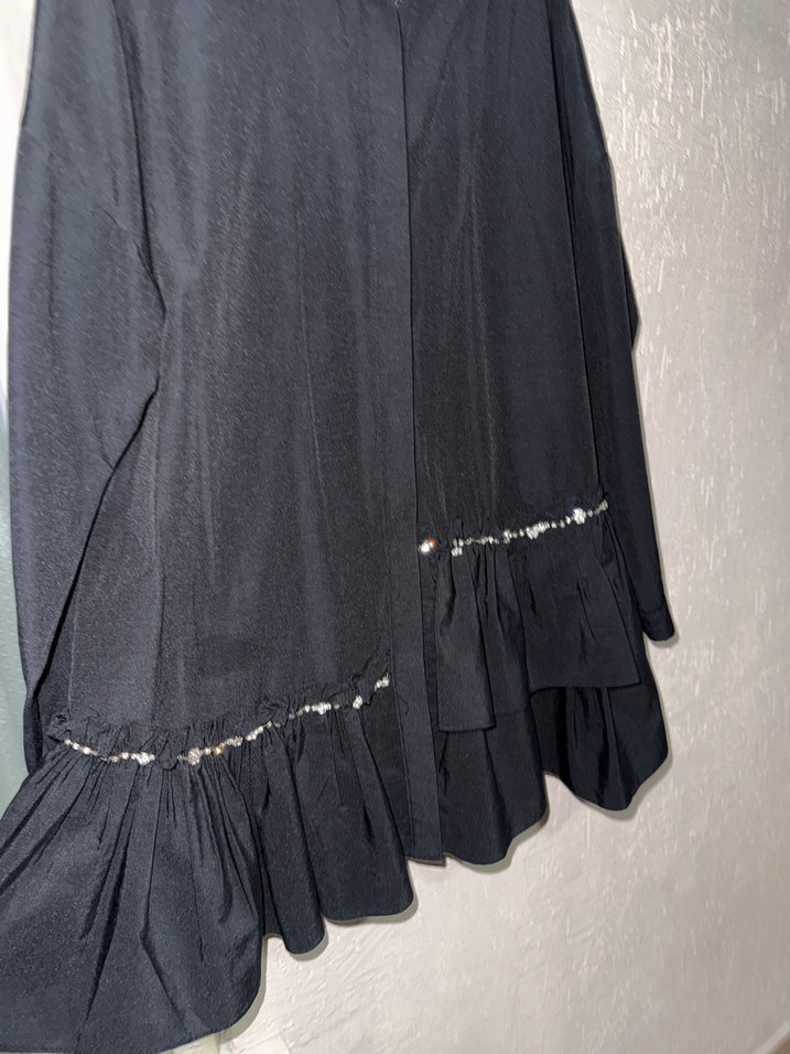 Uzun, bol kesim siyah bluzu, ipeksi dokulu, tekne yaka, askılı kollar ve nakışlı fırfır detaylara sahiptir.