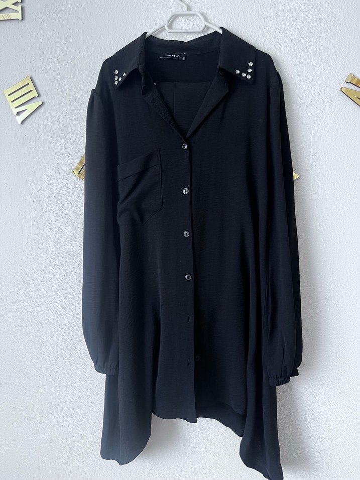 38 beden Düğmeli ve uzun kollu, siyah, bol kesim gömlek. Minimalist gotik tarzda, ayrobin kumaştan üretilmiştir.