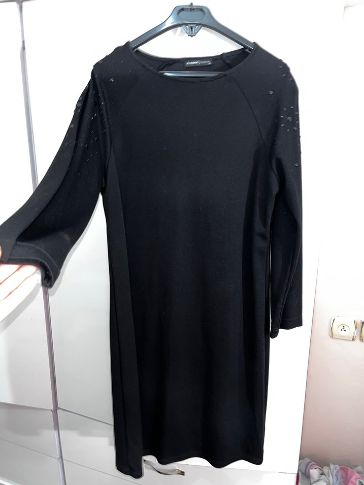 Uzun kollu, yuvarlak yakalı ve bol kesimli siyah elbise, hafif payet detaylarıyla gotik tarzda, ofis kullanımı için uygundur.