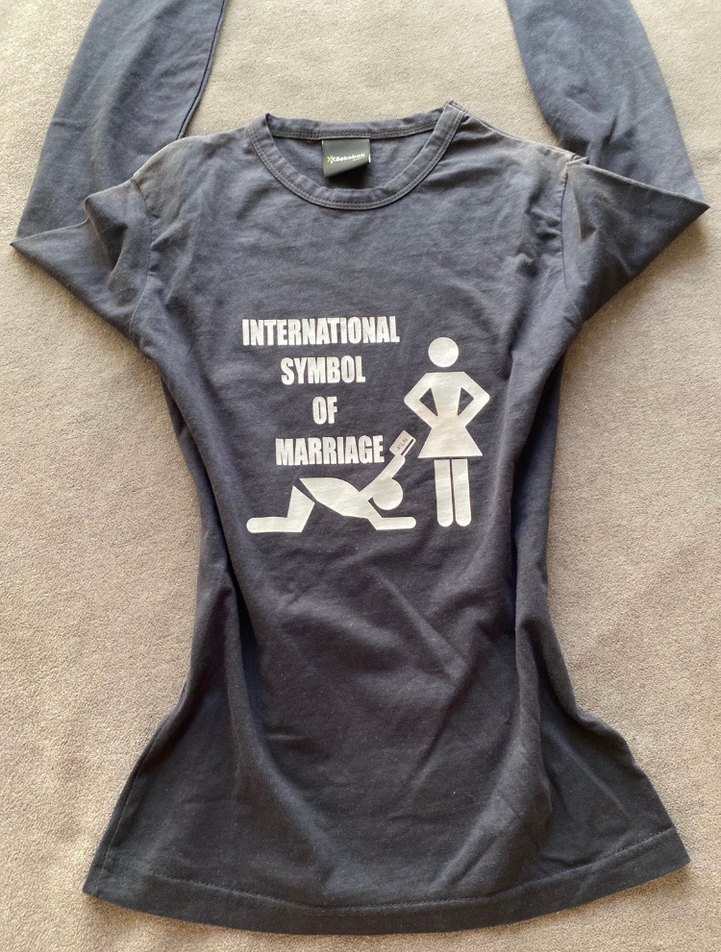 Sentetik kumaştan, uzun kollu ve bisiklet yaka, baskılı gri hamile gömleği. 'International Symbol of Marriage' yazısı ve figürü bulunur. Romantik akşamlar için uygun.