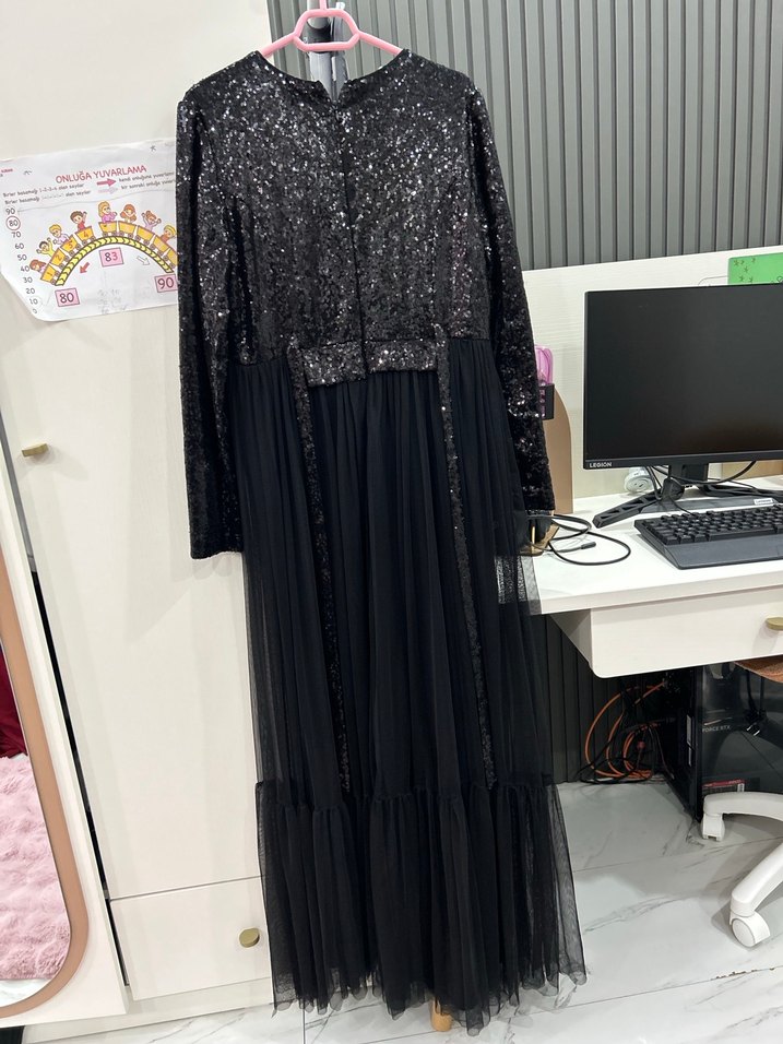 Uzun kollu, bol kesim siyah gotik abiye elbise. Üst kısmı koyu renk pul işlemeli, etek kısmı kat kat fırfırlı desene sahip, parti için uygun.