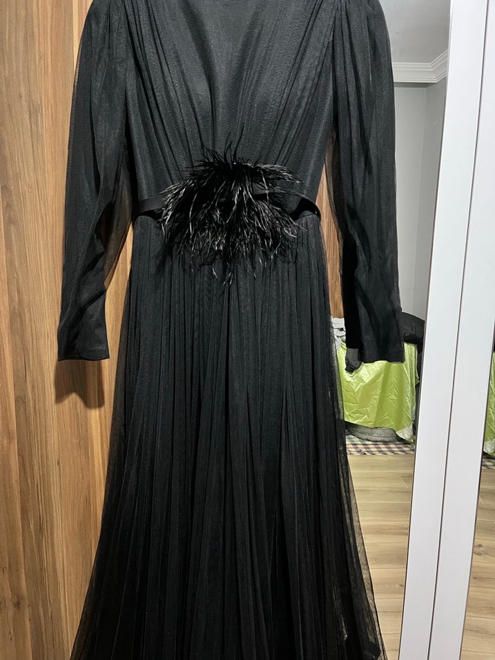 Uzun kollu, siyah ve pileli etekli bu dar kesim abiye elbise, yakasında kesik yaka ve belinde tüy detayına sahiptir. Gotik tarzı yansıtır, düğün veya özel etkinlikler için uygundur.