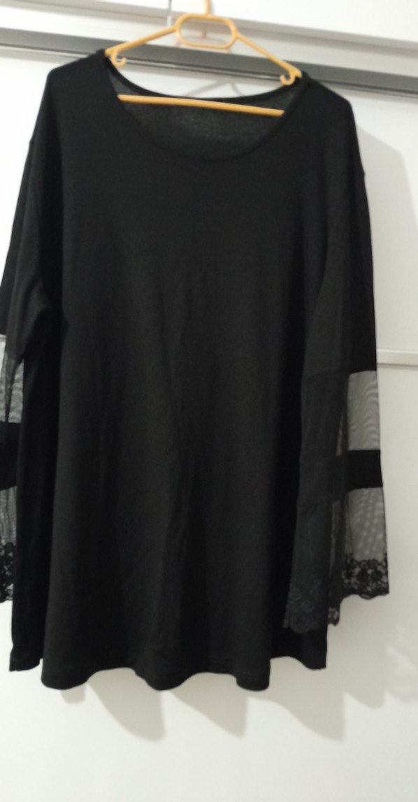 Siyah uzun kollu, bol kesim, dökümlü ve transparan kollu gotik tarzda bluz. Yumuşak sentetik kumaştan, günlük kullanıma uygun uzun kesim.