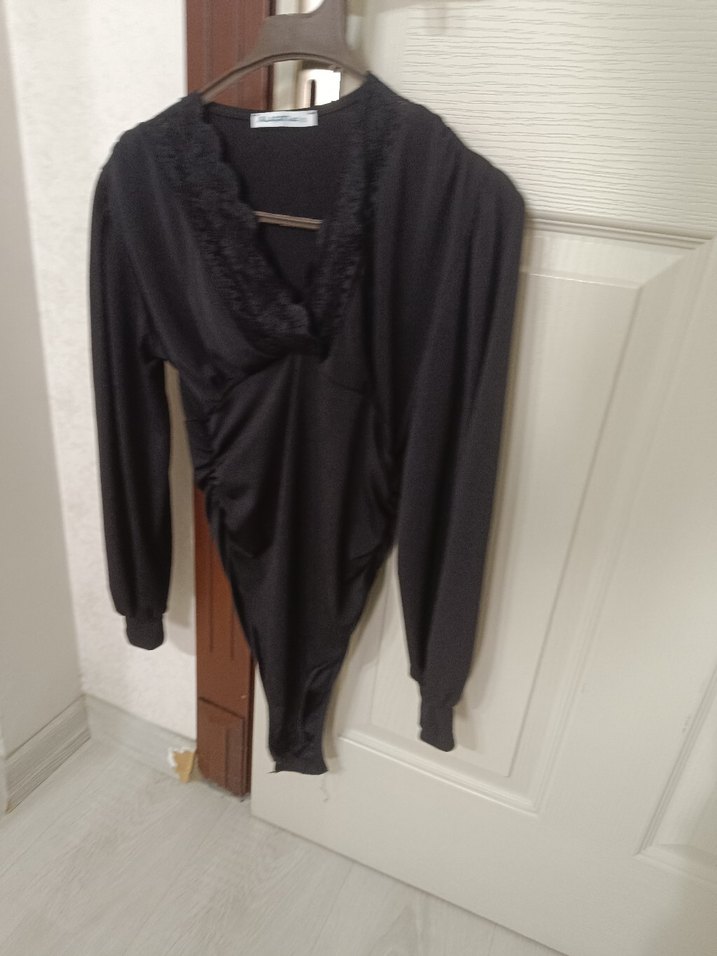 Uzun kollu, bisiklet yaka ve vücuda oturan siyah bluz. Yumuşak sentetik kumaştan yapılmış, midi boy ve gotik tarzda, şık bir görünüm sunar.