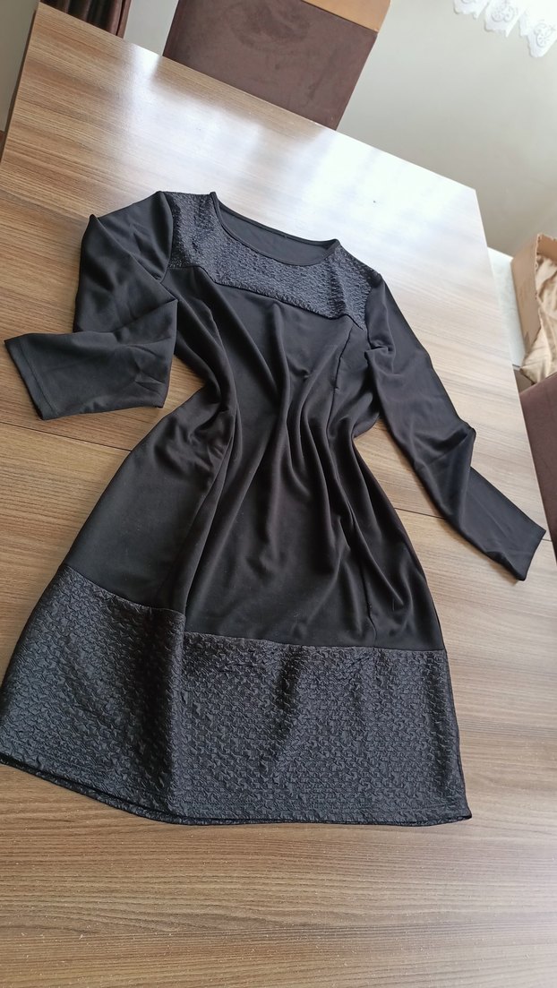 Siyah renkte, uzun kollu ve bisiklet yaka , organize kumaş dikimi elbise, göğüs ve etek kısmında organize detaylara sahip, rahat kesim ve gotik tarzda.