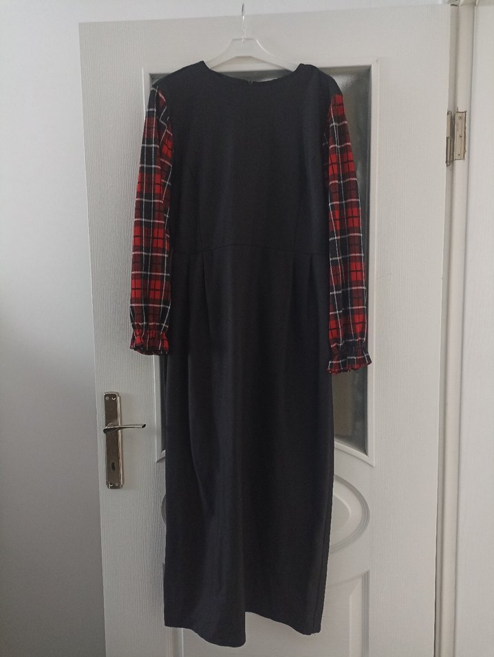 Bu uzun siyah elbise, bol kesim ve drapeli detaylara sahip olup, uzun ekoseli kollar ve bisiklet yaka ile gotik tarzı yansıtıyor.