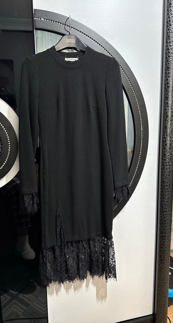 Bu siyah uzun elbise, uzun kollu ve fırfırlı dantel manşetlere sahip, işlemeli dantel etek ucu ve ön yırtmaç ile sentetik kumaştan üretilmiştir. Yuvarlak yaka ve dar kesimlidir, günlük kullanım için uygundur.