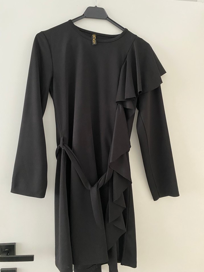 Siyah uzun kollu, vücuda oturan gotik tarzda, bir yanında fırfır detaylı Paris esintili elbise. 2. Fotoğrafta lekesini belirttim