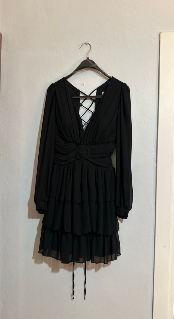 Uzun kollu, V yakalı siyah oturan gece elbisesi. Fırfırlı ve batik desenlidir, romantik akşamlar için uygundur.