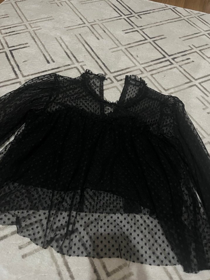 Siyah gotik fırfırlı bluz, uzun kollu ve V yakalıdır. Hafif sentetik kumaştan, bol kesim ve midi boydadır, şeffaf puantiyeli desene sahiptir.