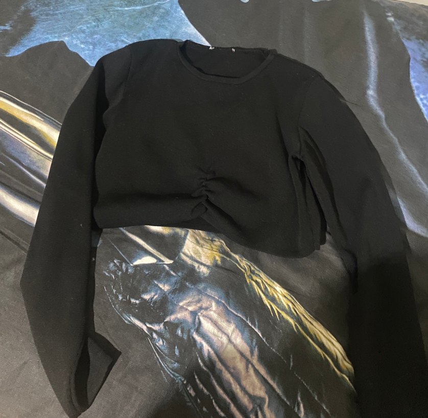 Uzun kollu, yuvarlak yakalı, drapeli detaylı siyah gotik tarzda hamile tişörtü. Koyu sentetik kumaştan, günlük kullanım için uygun.