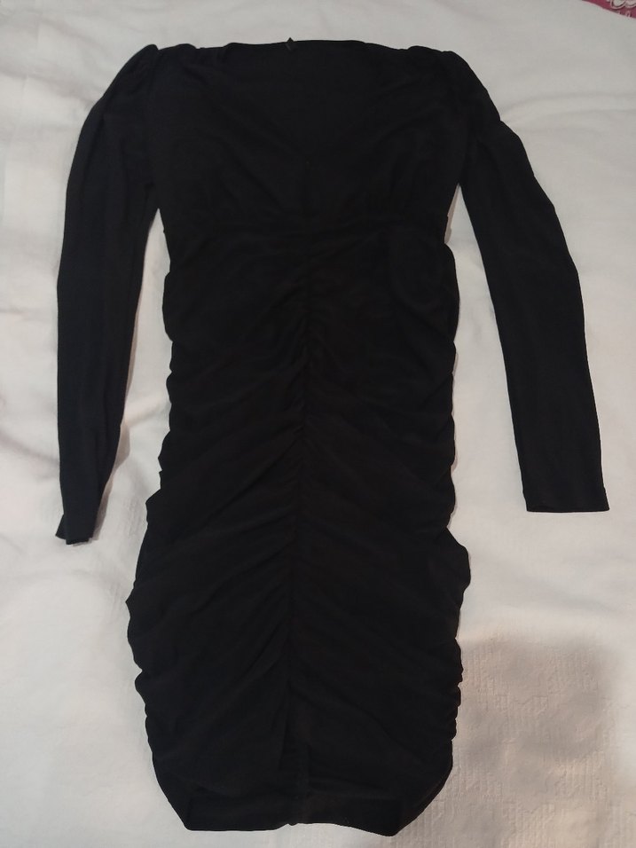 Uzun kollu, V yakalı, drapeli siyah abiye elbise, gotik tarzıyla cesur ve romantik geceye uygun. bir kez giyildi. göğüs dekolteli