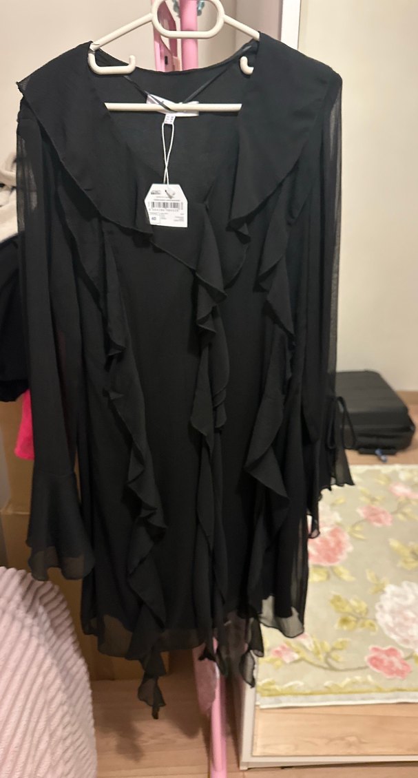 Siyah uzun kollu, V yakalı, fırfır detaylı ve bol kesim gotik kadın abiye elbise. Baskılı deseniyle parti için uygun.