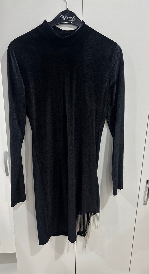 Bu siyah, uzun kollu, yüksek yakalı ve vücuda oturan abiye elbise, drapeli tasarımı ve etek ucundaki püskül detayıyla romantik akşamlar için uygun.