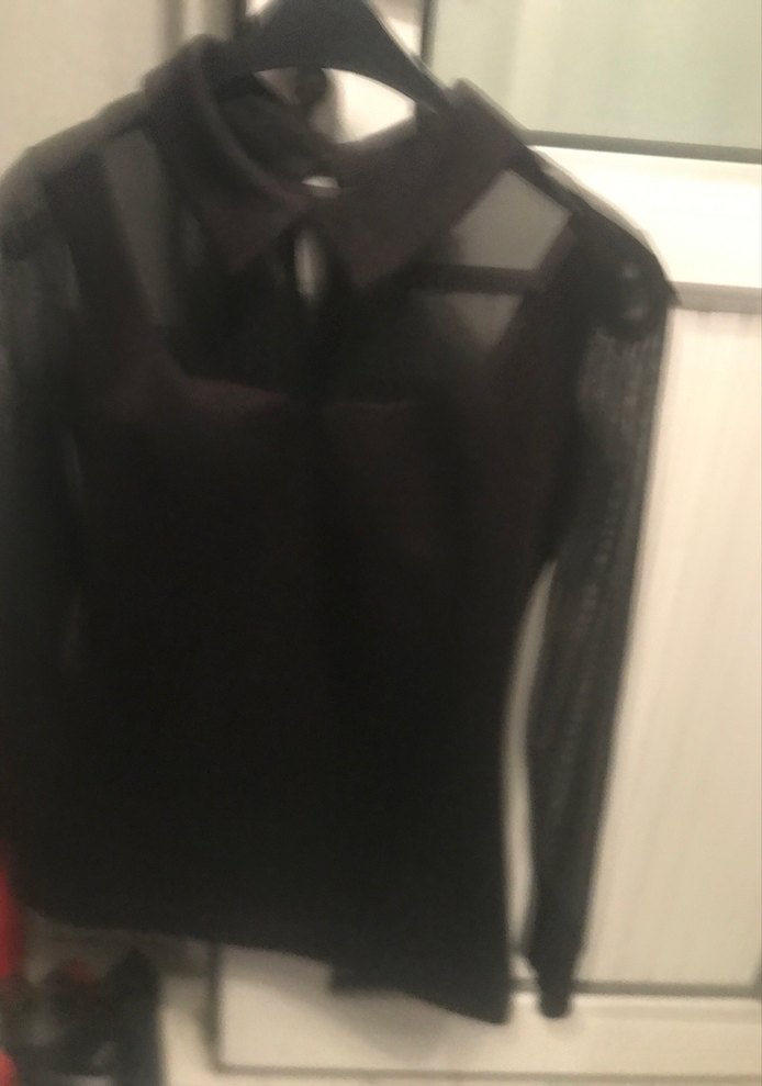 Uzun kollu, yakalı ve kemerli siyah bluz. Sentetik kumaştan yapılmış, gotik tarzda ve ofis kullanımı için uygun.