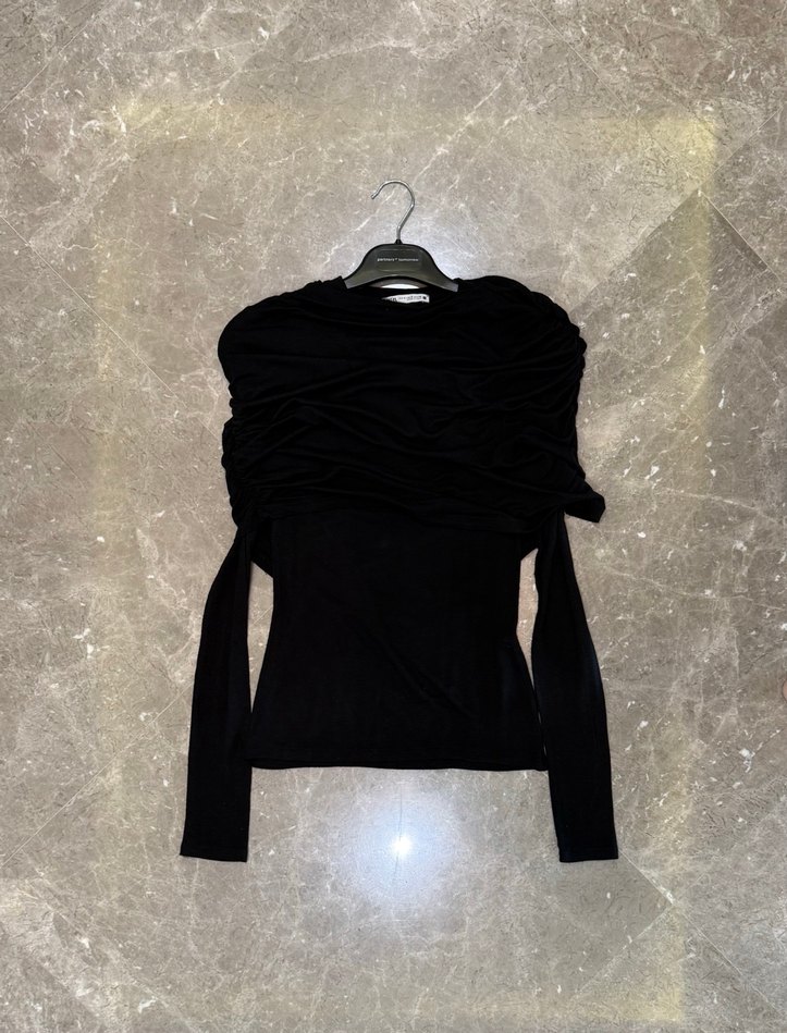 Drapeli ek yakalı ve uzun kollu siyah kumaştan vücuda oturan gotik tarzda bir bluz.