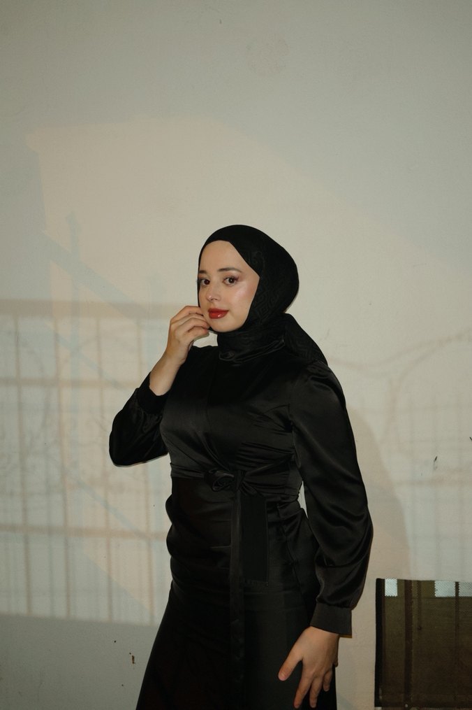 Bu dar kesim kadın elbise uzun kollu, koyu siyah renkte ve etnik desenlere sahip, minimalist gotik tarzı yansıtıyor. Uzun boyu şıklık katıyor.