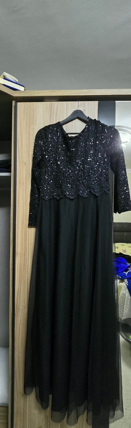 Uzun kollu, V yakalı, siyah, pul işlemeli üst kısmı drapeli, alt kısmı sade ve bol kesim olan gotik tarzda uzun elbise. Parti için uygun klasik şıklık sunar. Bir kaç kere giyildi