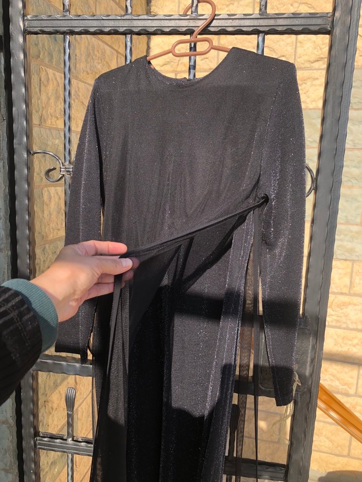 Siyah uzun kollu elbise, bol kesim ve drapeli detaylara sahip. Sentetik kumaştan üretilmiş, yuvarlak yaka ve modest gotik tarzda. Abiye