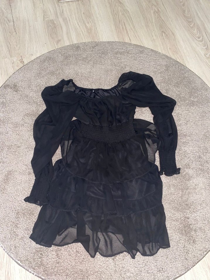 Uzun kollu, tek renk siyah gotik kadın elbise, balıkçı yaka ve volan detayları ile şık ve trend bir görünüm sunar.