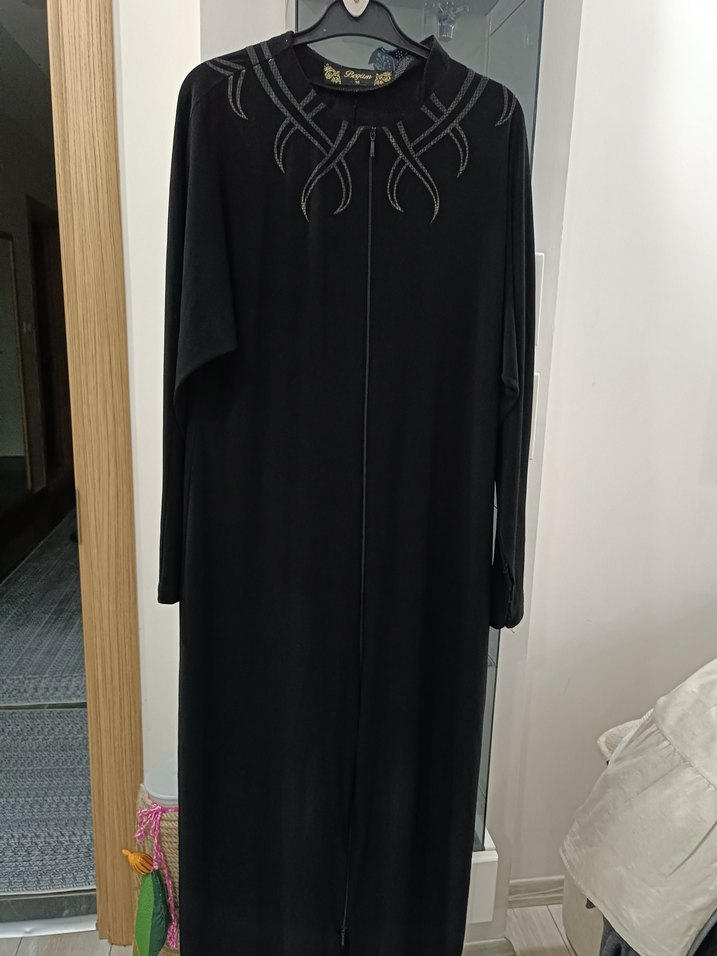 Siyah, uzun kollu, vücuda oturan gotik tarzda kadın elbisesi. Yaka çevresinde ince detaylar bulunur, uzun boydadır.
